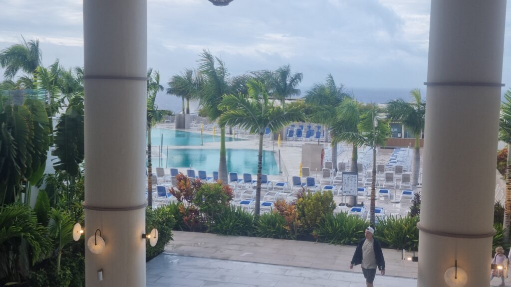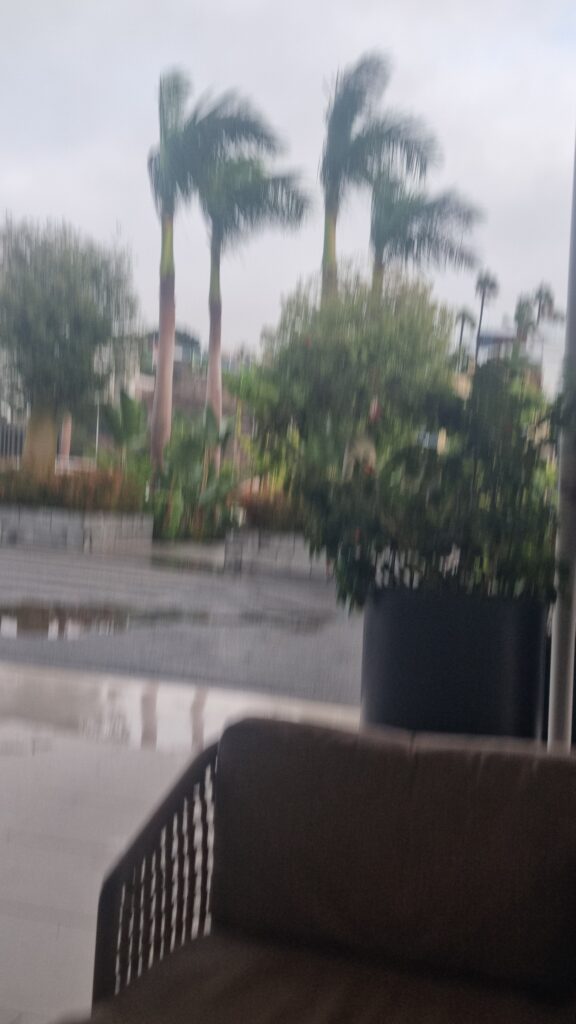 Det skulle regna och blåsa något fruktansvärt och vi gjorde oss beredda på ”inlåsning” på hotellet. Det var ”kod orange” på varningarna, vilket är det näst högsta på skalan.
