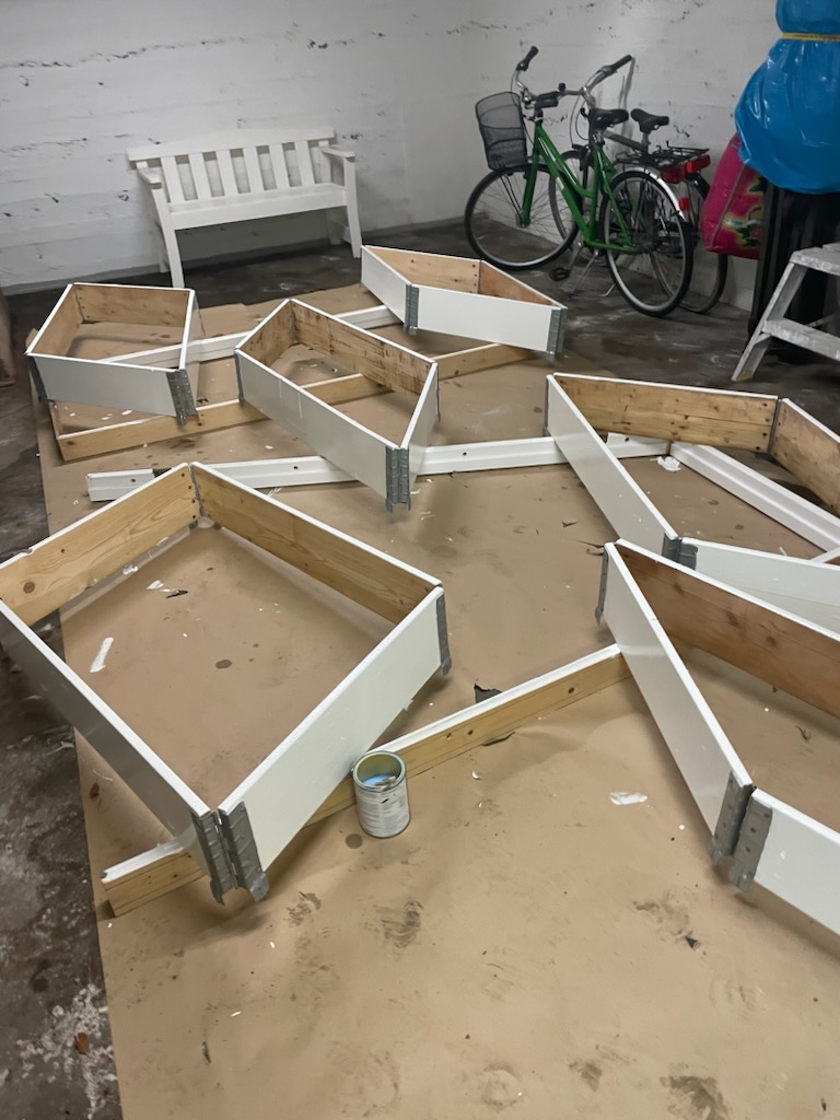 Uppe i "fabriken" hade Robban pallkragar stående och det var ju synd att dom bara skulle stå där till ingen nytta när jag kunde använda dom till odling tänkte jag. Det var även synd att dom inte var vita 🙈 Men är man gift med en målare så är man. Är man dessutom gift med världens snällaste målare så blir dom ganska så snart vita.