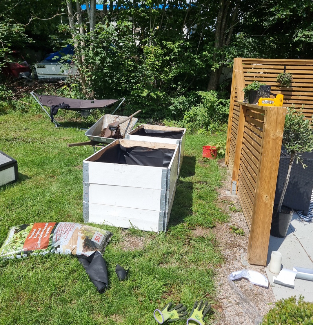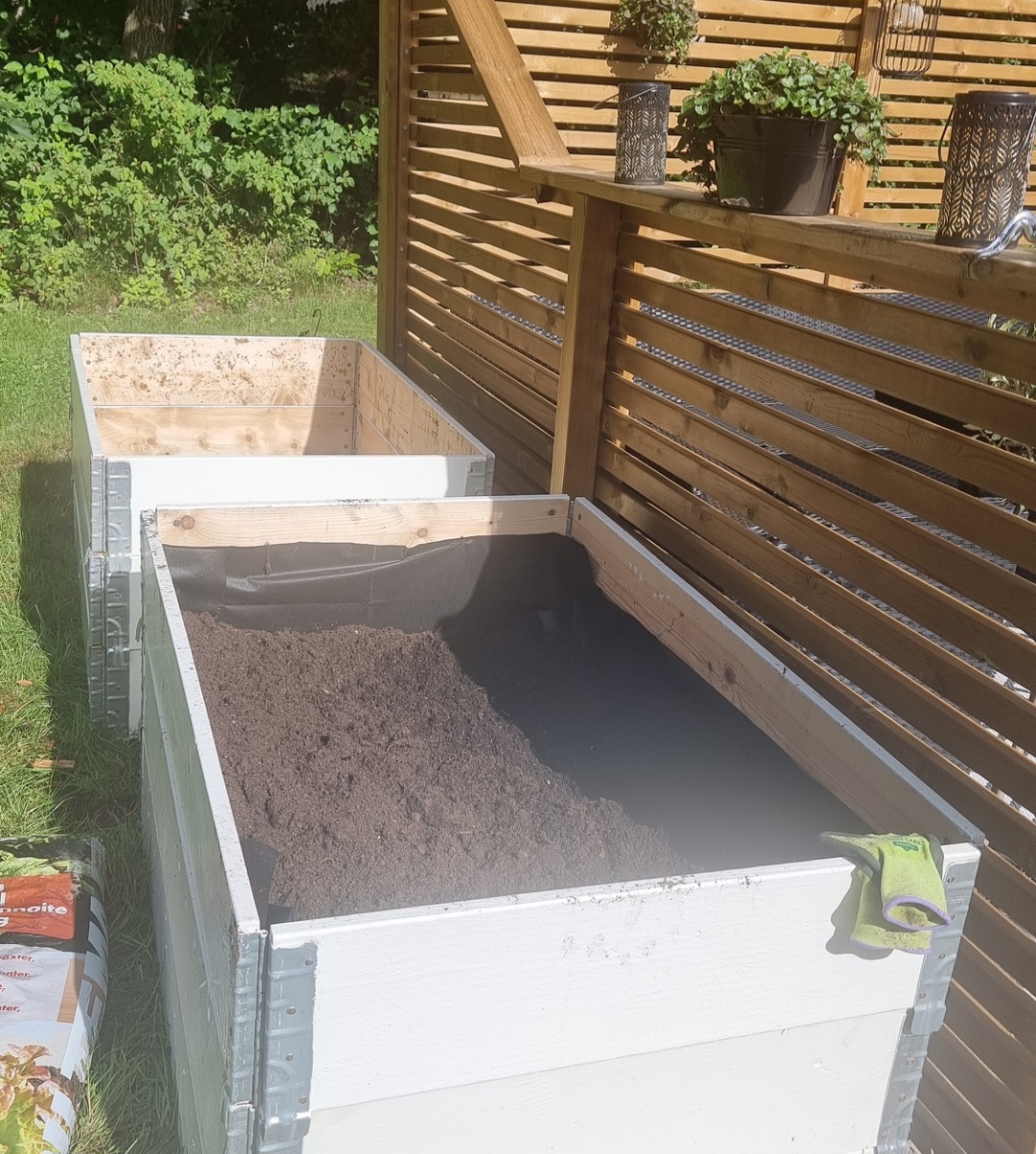 När en (eller i mitt fall 3) pallkragar är fulla med jord så står dom där dom står så att säga. 🙄 Nu fanns det bara 2 alternativ.