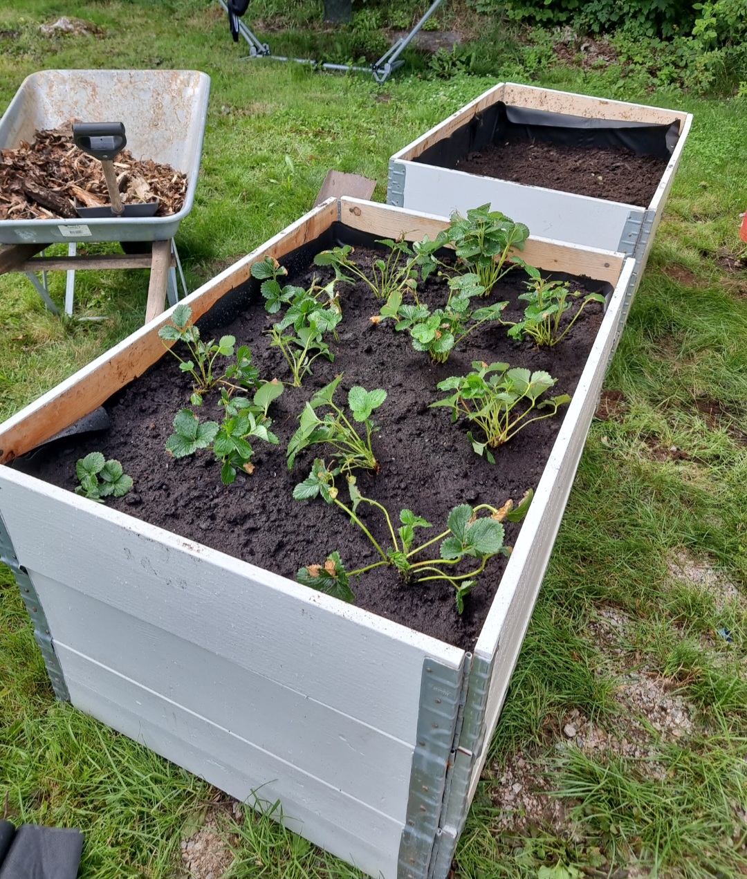 Sen planterade jag om alla mina jordgubbsplantor från växthuset till pallkragarna.
