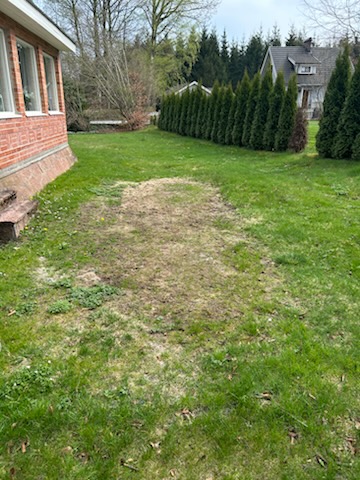 Detta förslag nästan fnös Robban åt! Det skulle se för jävligt ut att ha plattor där sa han. Ja, till skillnad från hur det ser ut med en halvdöd gräsmatta då menar han?