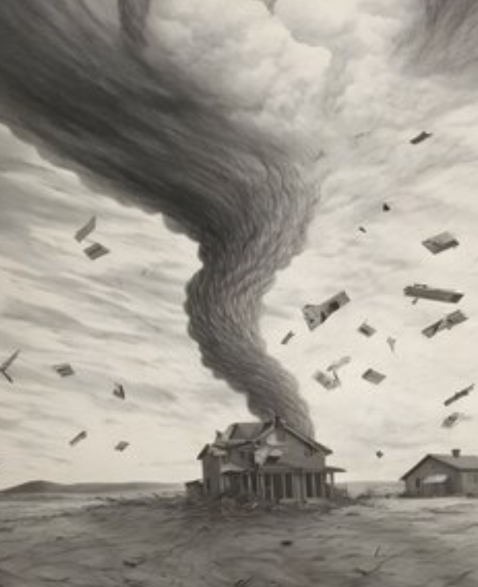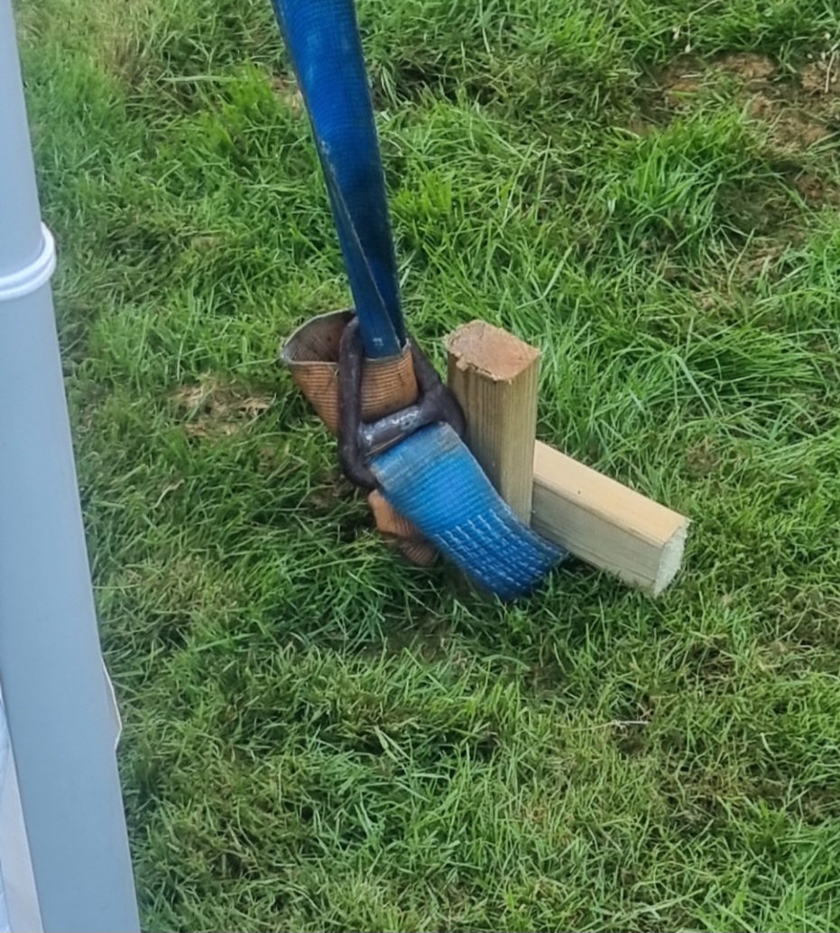 Robban spikade kors av trä som han slog ner i marken på båda sidor om tältet. Och i korset fäste han sen spännband som gick över tältet och höll det på plats. Skulle vädret ta tältet så skulle det krävas en tornado.
