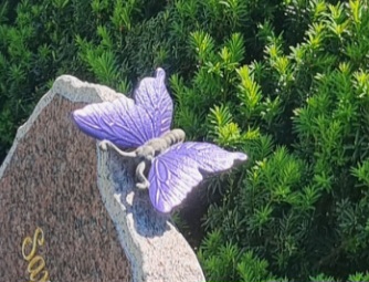 Veckorna efter att mamma hade gått bort så blev jag nästa förföljd av fjärilar. Något som ett medium även berättade för mig och han sa att det var ett tecken från mamma. Det har gjort att jag förknippar mamma med fjärilar. Så när jag hittade en stor fjäril i gjutjärn så köpte jag den. Sen hjälpte Robban mig att måla vingarna på den i mammas favoritfärg, lila, så att den blev mer personlig. Jag satte den uppe på mammas sten så att det nästan såg ut som att den landat där.
