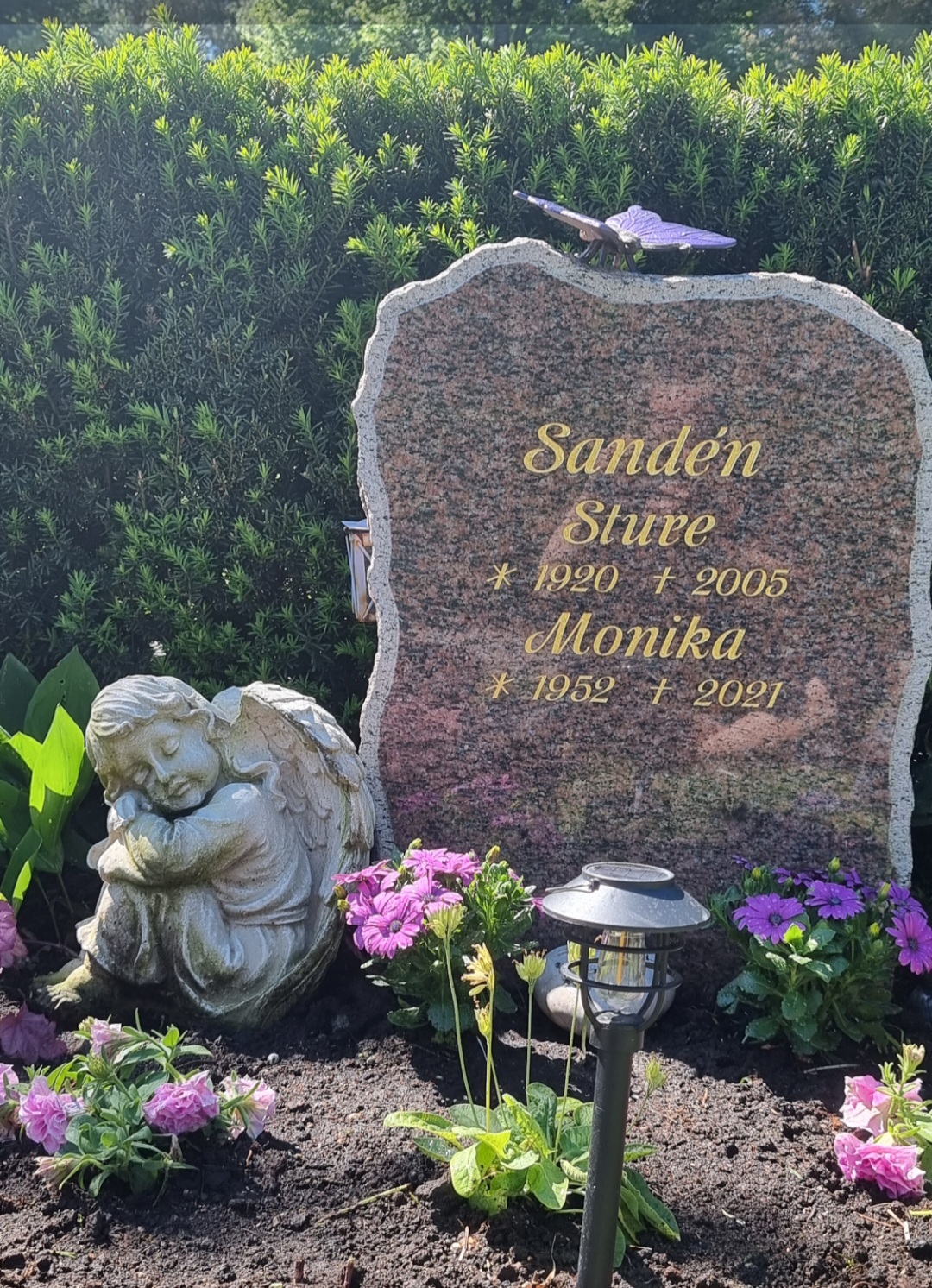 Direkt när man kommer utanför kyrkogårdens grindar så ser man mammas sten för att jag har lagt en fjäril i gjutjärn uppe på den.