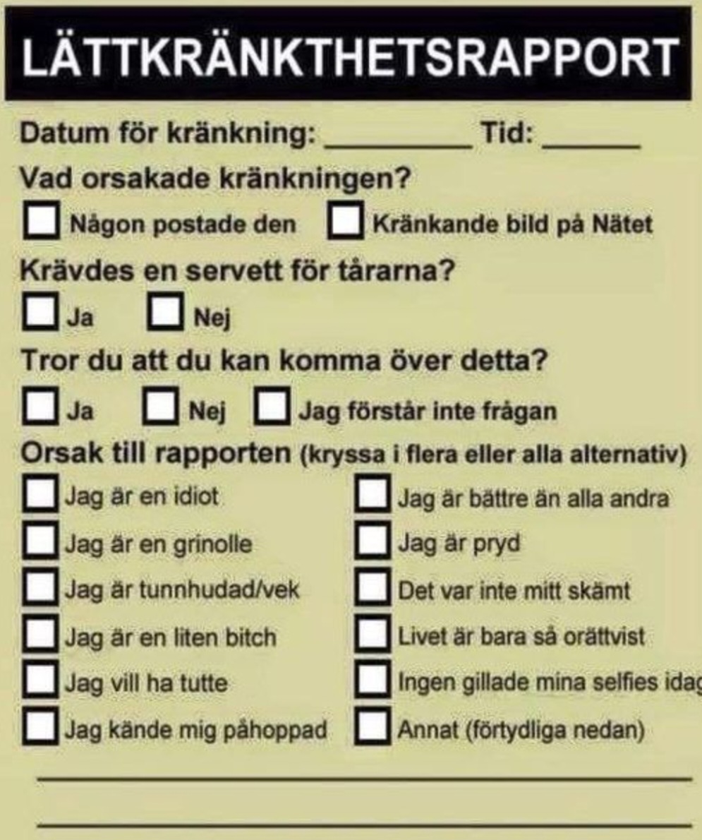 Folk som vet med sig att dom är lättkränkta gör också klokast i att sluta läsa. Dock så är väl dom lättkränkta sällan medvetna om att dom är just lättkränkta? 🤔