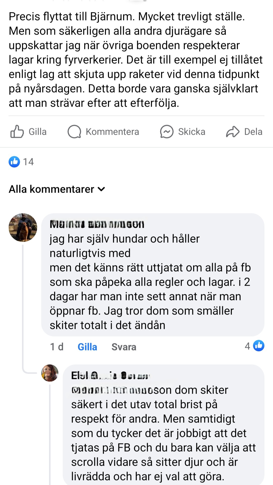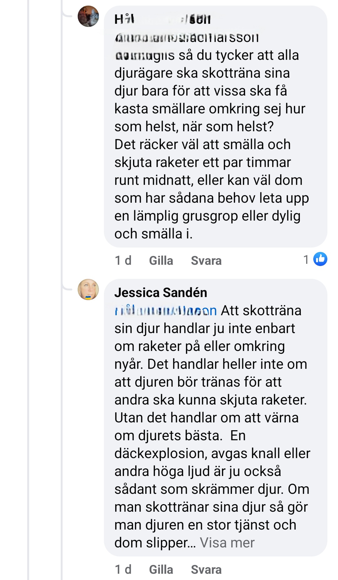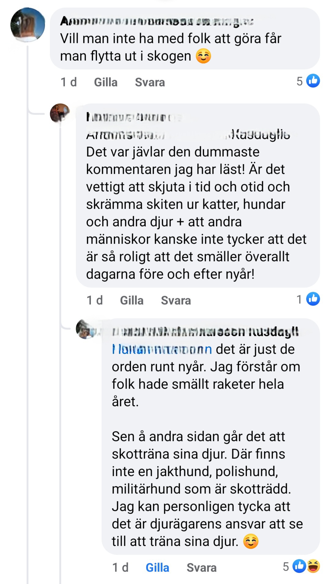 Kommentarerna fortsatte, fortsatte och fortsatte från en den ena en den andra som ville uttrycka hur synd det är om deras hund, katt, marsvin och vägglöss. Och JA, jag håller till 100% med om att det är synd om deras djur. Inte för att det smäller utan för att dom har ägare som tror att klagomål på Facebook funkar bättre än att skotträna.