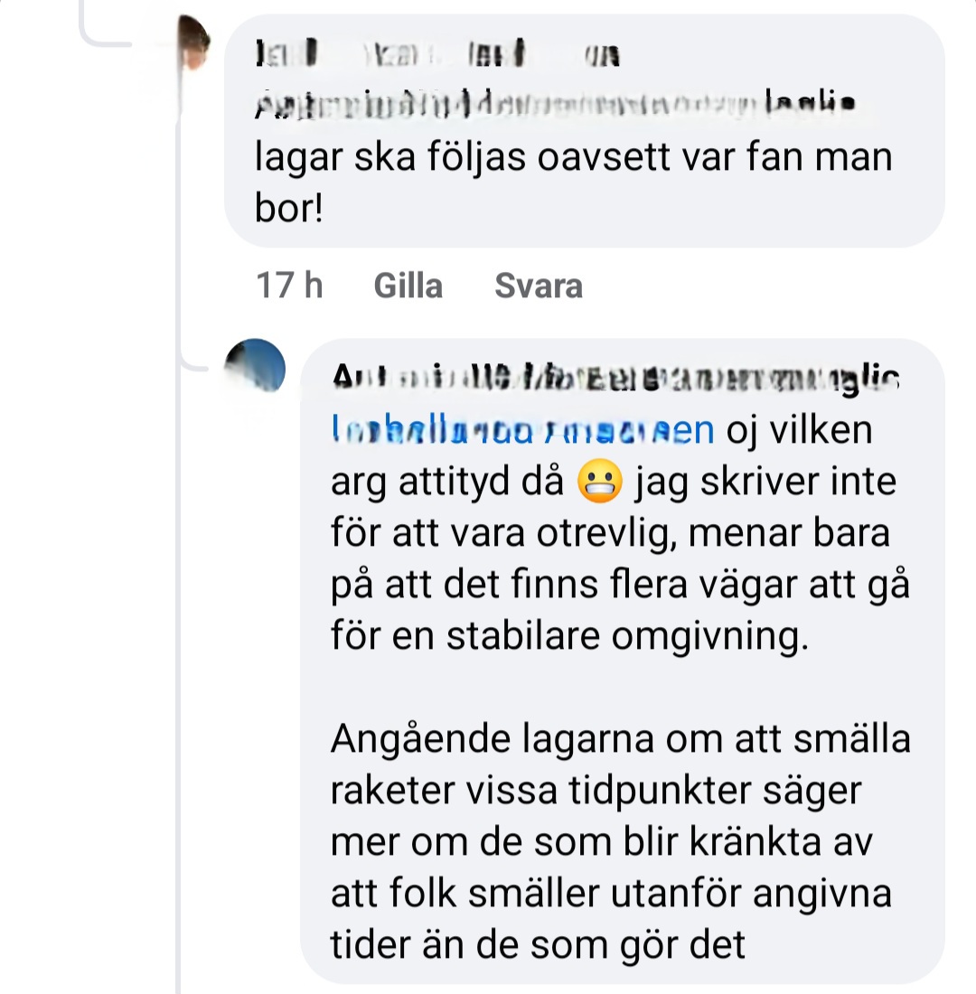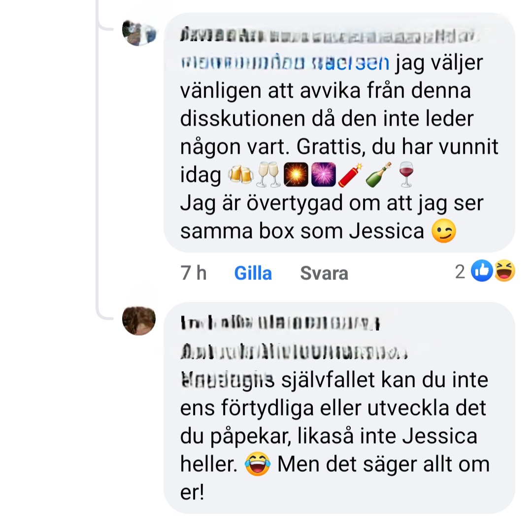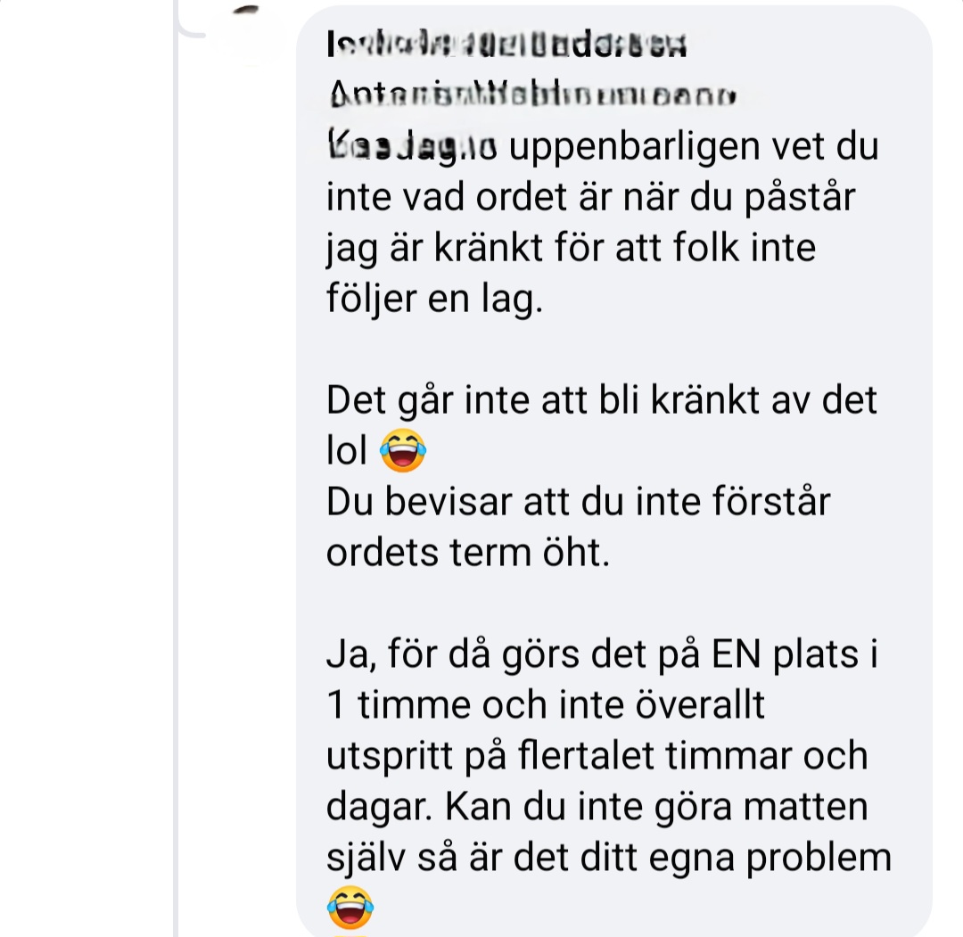 Och tänk så rätt jag hade. Röken från smällaren han inte ens skingras innan första kommentaren kom. Av hänsyn till att en del är så pass lättkränkta att dom tom. kan kränkas av sina egna kommentarer så har jag raderat namn och bild på kommentatorerna. För rättvisans skull så har jag gömt allas namn och bild (utom mitt eget) trots att jag vet att en av kommentatorerna utan problem skulle stå för det h*n skriver och dessutom inte ens vet hur man känner sig kränkt 🤣