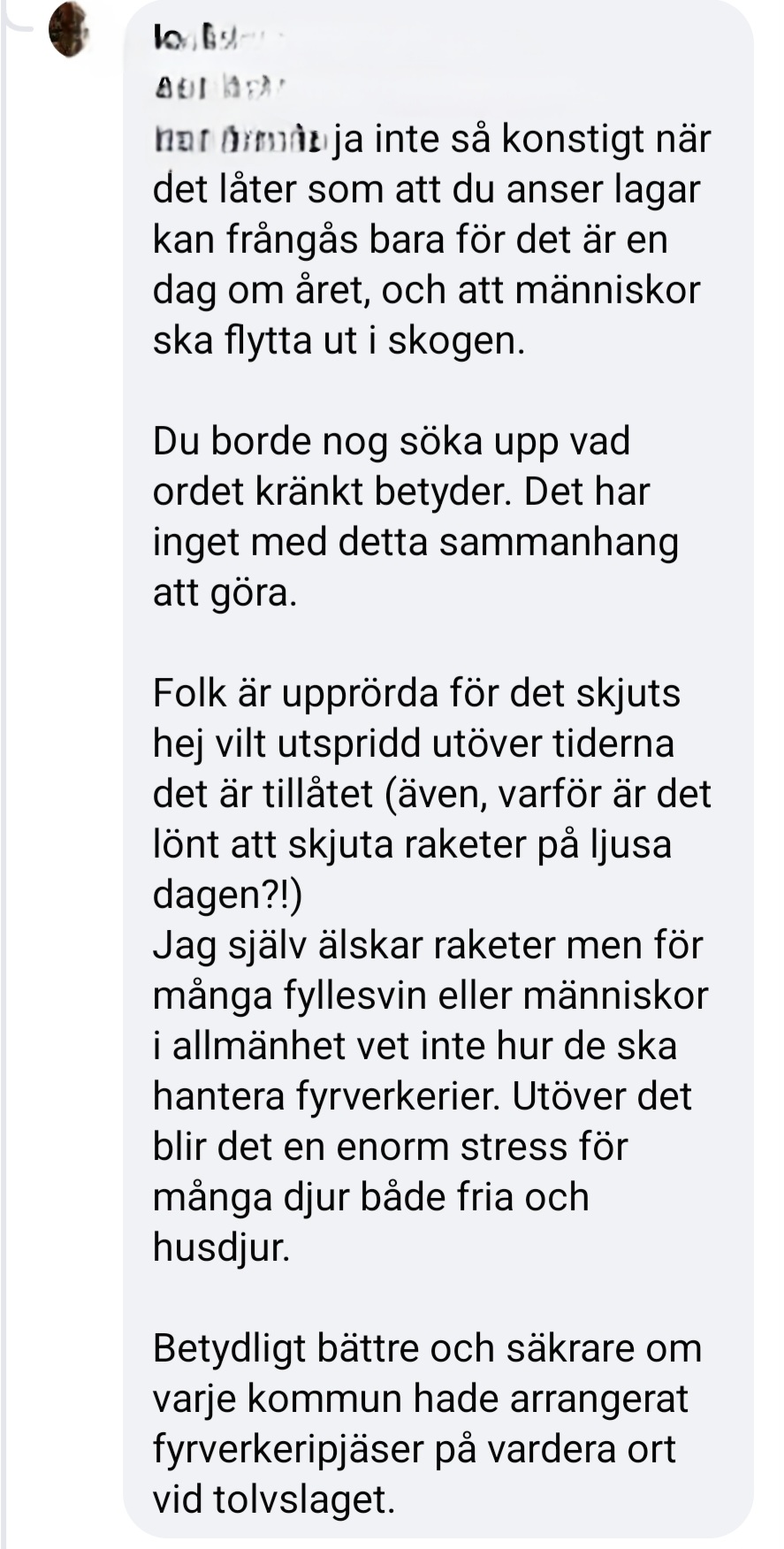 Mig personligen stör det inte speciellt mycket om det smälls lite här och där. Det som stör mig något jävulskt är istället alla dessa klagomål i sociala medier. Dom är fan fler och värre än dom fyrverkerier som fyras av. 🙄 Och jag vet inte vad personen som skriver tror att han/hon ska uppnå med sitt gnäll. Om inte ens LAG kan förhindra att det smälls så lär ju knappast ditt inlägg på Facebook göra det!!
