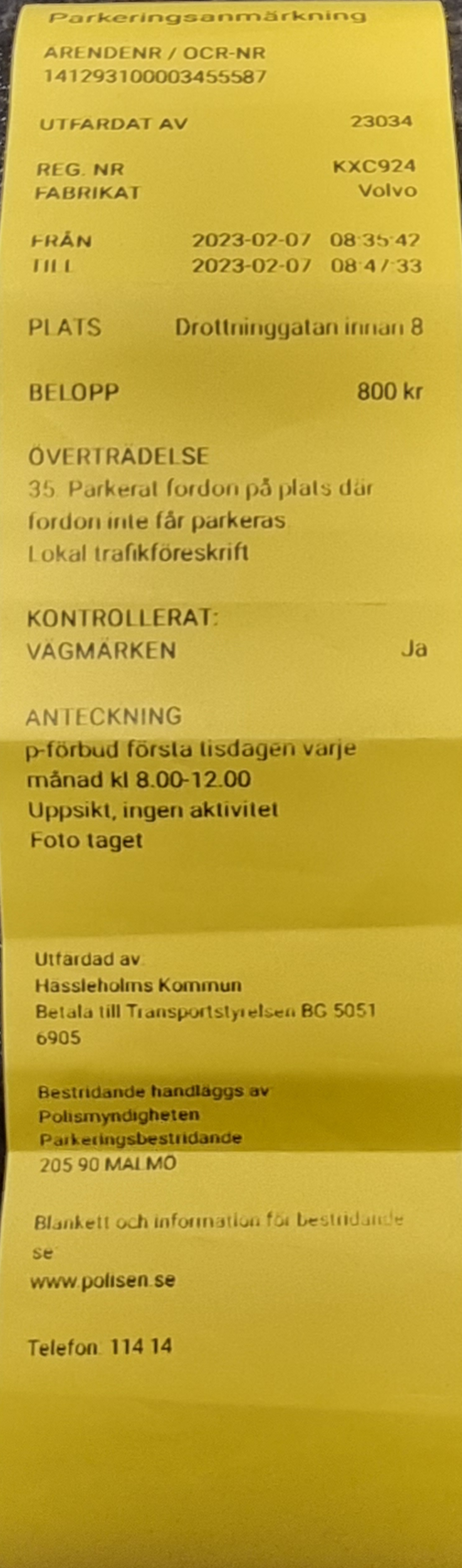 Vi skildes åt och jag fortsatte mot min bil som stod där så snyggt och prydligt på gratis parkeringen som just idag var allt annat än gratis!! På rutan satt en "snygg" liten böteslapp på 800kr!!! 😲