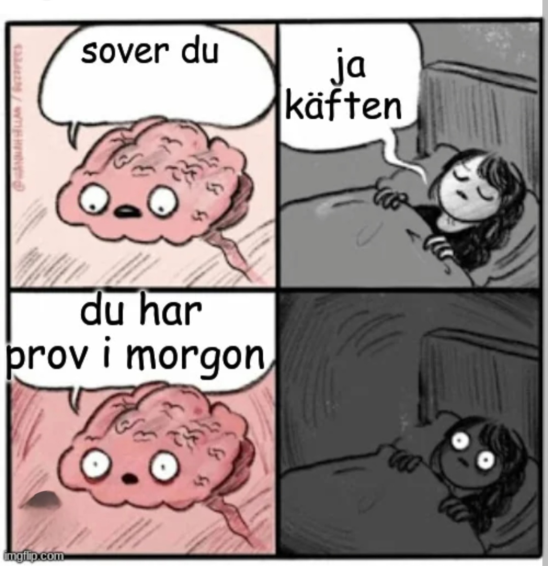 Denna veckan lär jag väl gå igenom som en zombie. För när jag ska ha prov så sover jag extremt dåligt. Jag vaknar alltid på natten innan prov och mår skit över att jag ska ha just prov. Och med tre prov samma vecka så lär det bli mycket störningar i sömnen. Jag borde ju ha vant mig kan man tycka, men nejdå, samma dåliga mående fortfarande.