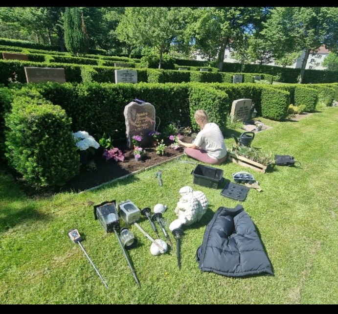 En del blommor, som sägs vara fleråriga, har visat att dom inte tänker komma tillbaka i år så den senaste tiden tycker jag att graven har börjat se lite vildvuxen och ovårdad ut. Det vill jag absolut inte att den ska göra. Så idag tog jag med mig "min" Ejla för att ta tag jag i att fixa till där igen. Plocka bort gammalt och visset och planterade nytt. Det känns så skönt att ha Ejla med när jag ska fixa där. När jag ska köpa blommor och sorgen slår till och gör mig handlingsförlamad så fångar hon upp mig och styr upp. Min egen "personliga assistent" ❤️