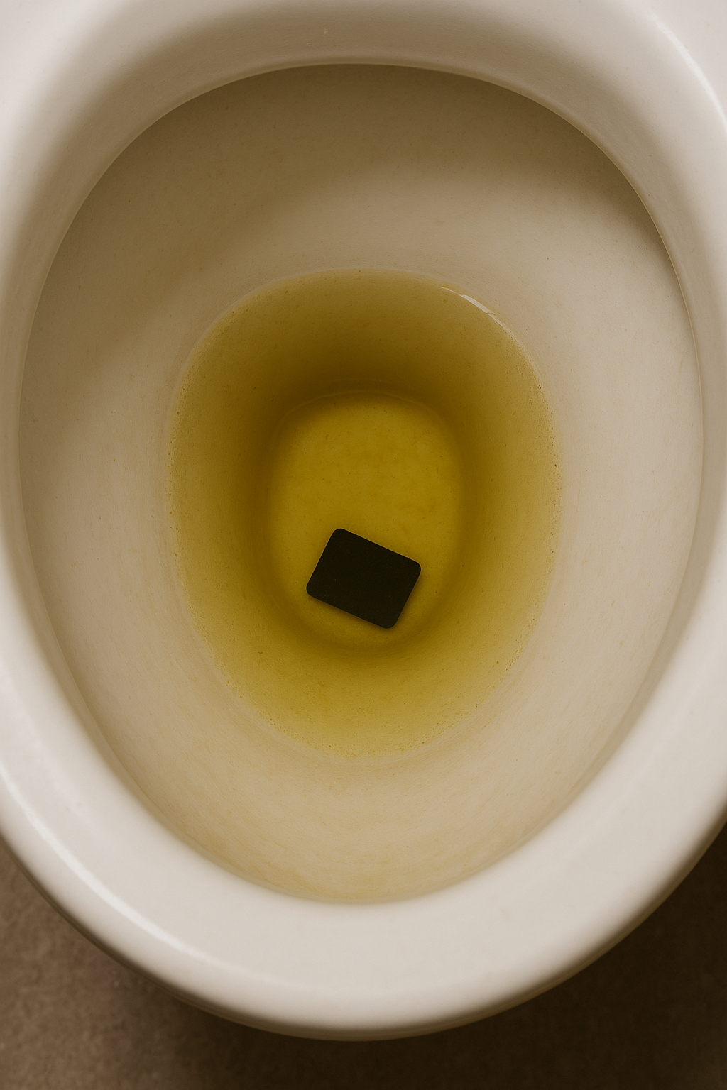 När jag reste mig upp och vände mig om för att spola så såg jag något svart på botten av toaletten. Det påminde om en påssnus fast bredare tänkte jag och tryckte på spolknappen.