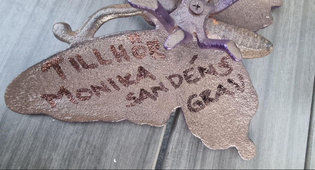 När jag köpte mammas fjäril så köpte jag samtidigt en till mig själv som har legat på uteplatsen som en "symbol" för mamma. Nu har Robban målat den också och jag har skrivit på undersidan av ena vingen.