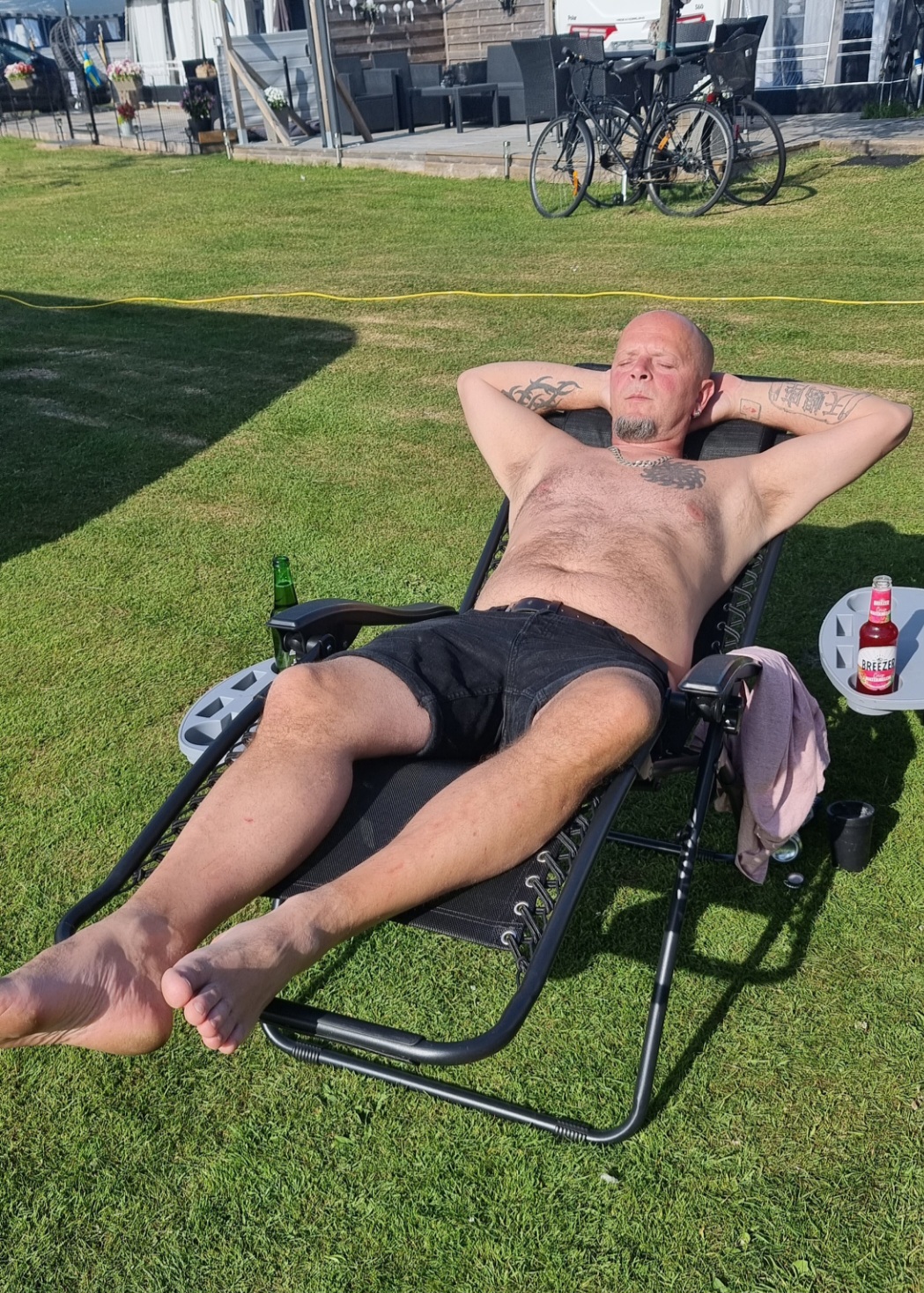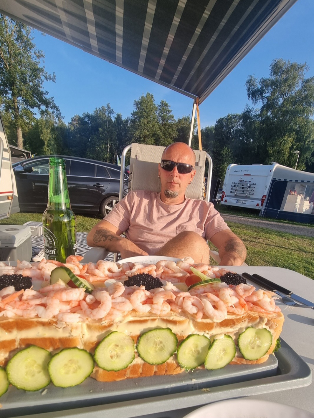 När vi väl fått ner stödben, rullat ut markisen och fått allt på plats så är det ju ganska så härligt att vara på camping trots allt....... även om man inte blir speciellt välkomnad när man kommer.