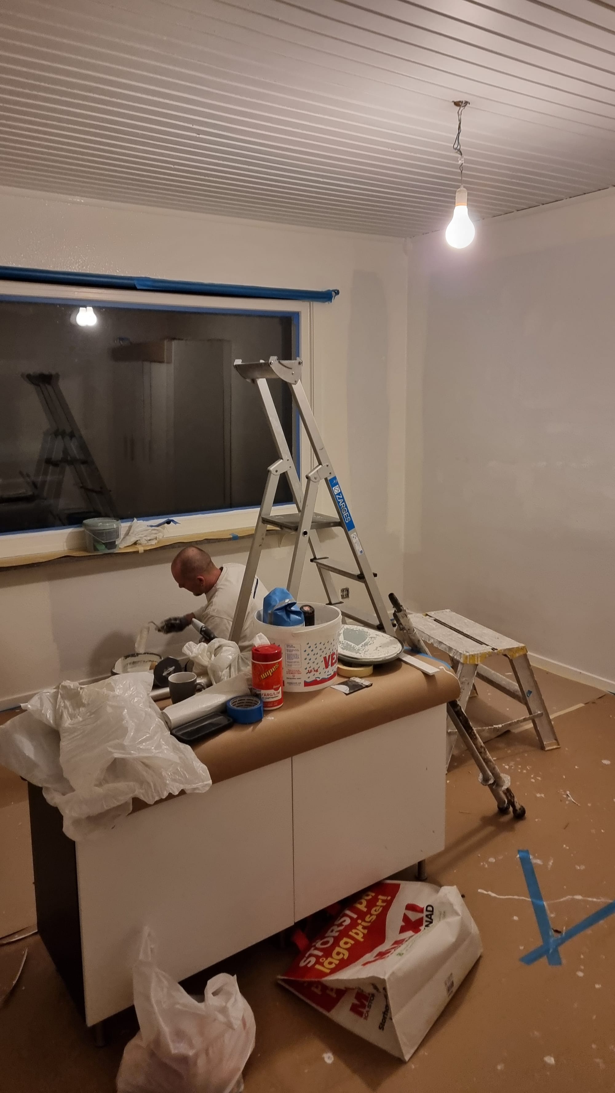 Väggarna behövde fräschas upp med ny färg och sen inredas för lek. Och Robban (som borde veta bättre) tänkte att det inte skulle behöva bli så mycket målning. Tak och väggar och så skulle det vara klart.