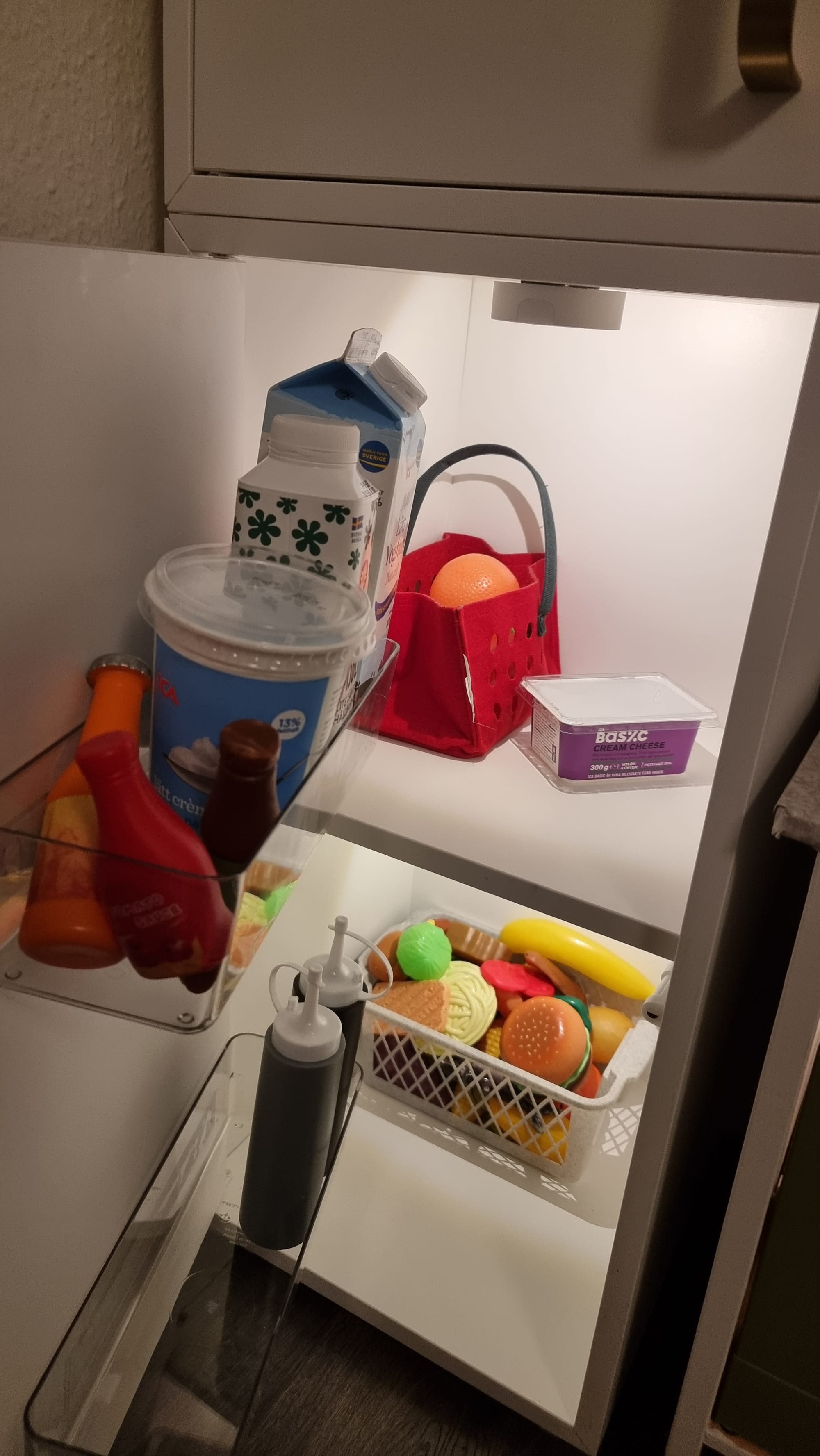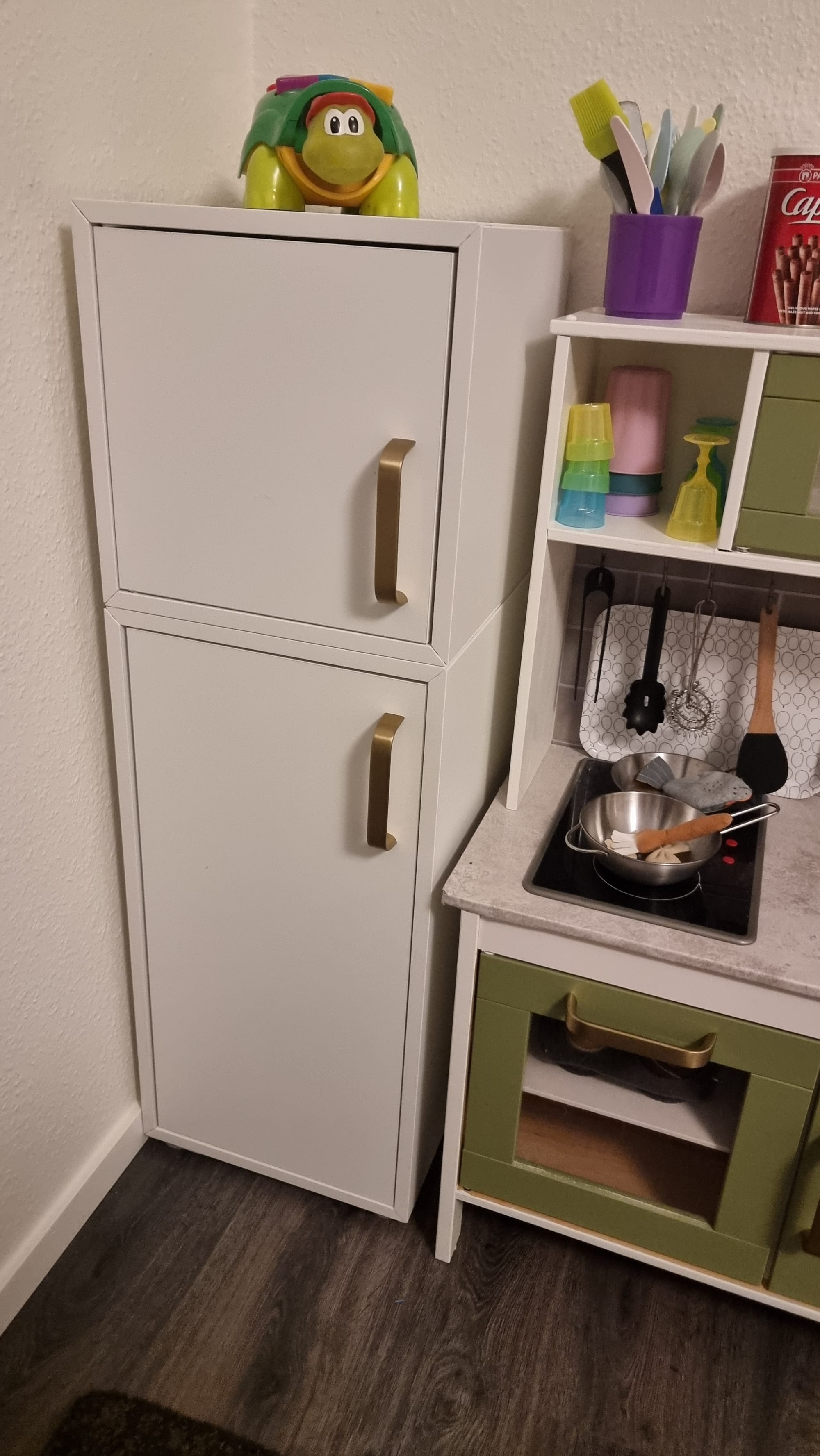 I ett kök måste man ju ha ett kylskåp!! Var ska annars mina älskade barnbarn förvara sina kylvaror? 😜 Så jag gav mig av till Ikea för att köpa skåp att bygga en kyl av. Och så klart lite hyllor, madrass till sängen som skulle stå där inne och lite annat smått och gott som behövdes.