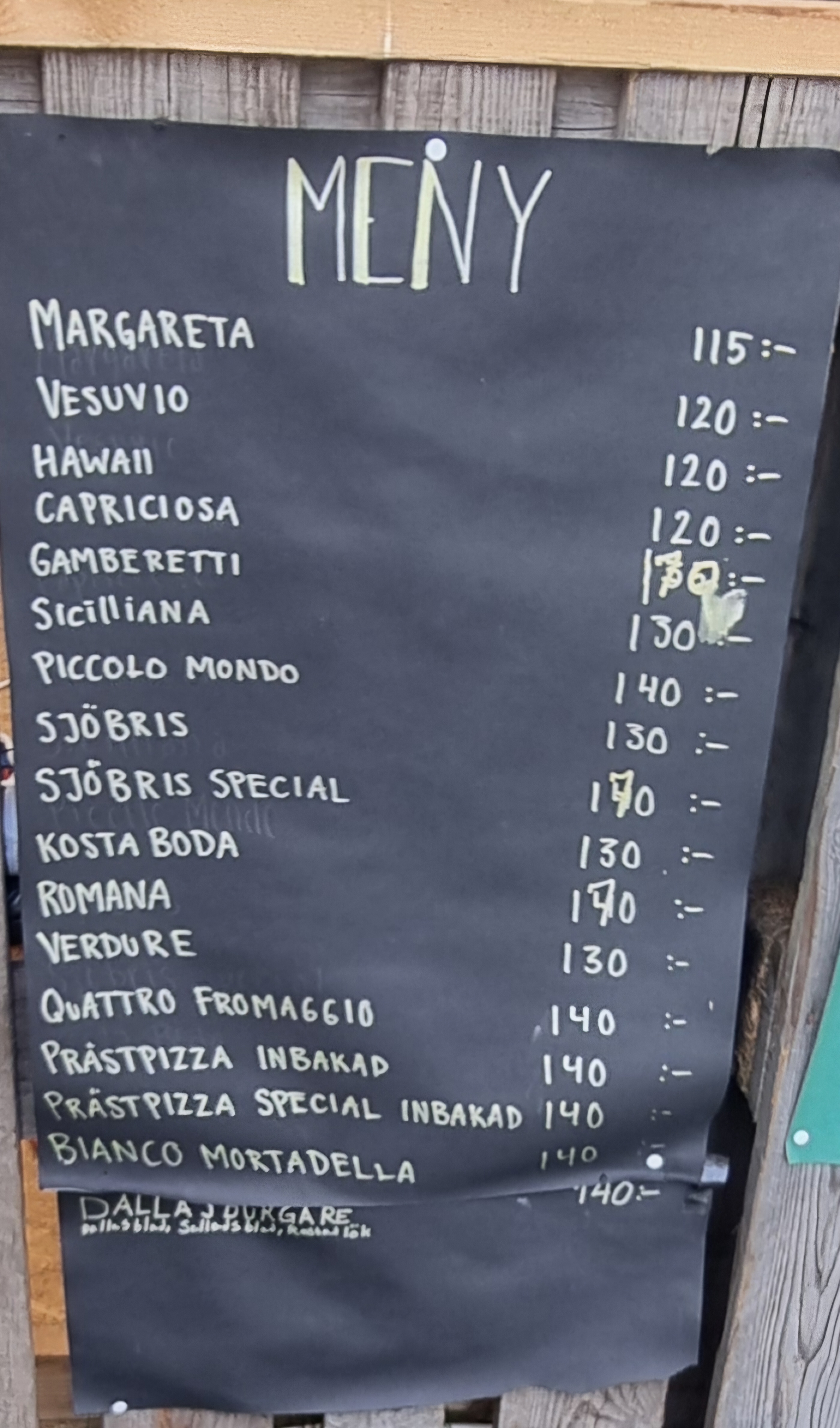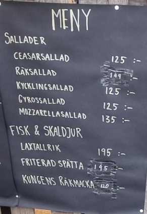 När vi kom så var en kvinna i full färd med att höja priserna på menyn. Detta var tydligen så pass bråttom att det behövdes göras på stört. Hon släppte inte pennan eller ens flyttade sig för att vi kom så vi fick försöka se menyn så gott det gick över axeln på henne.