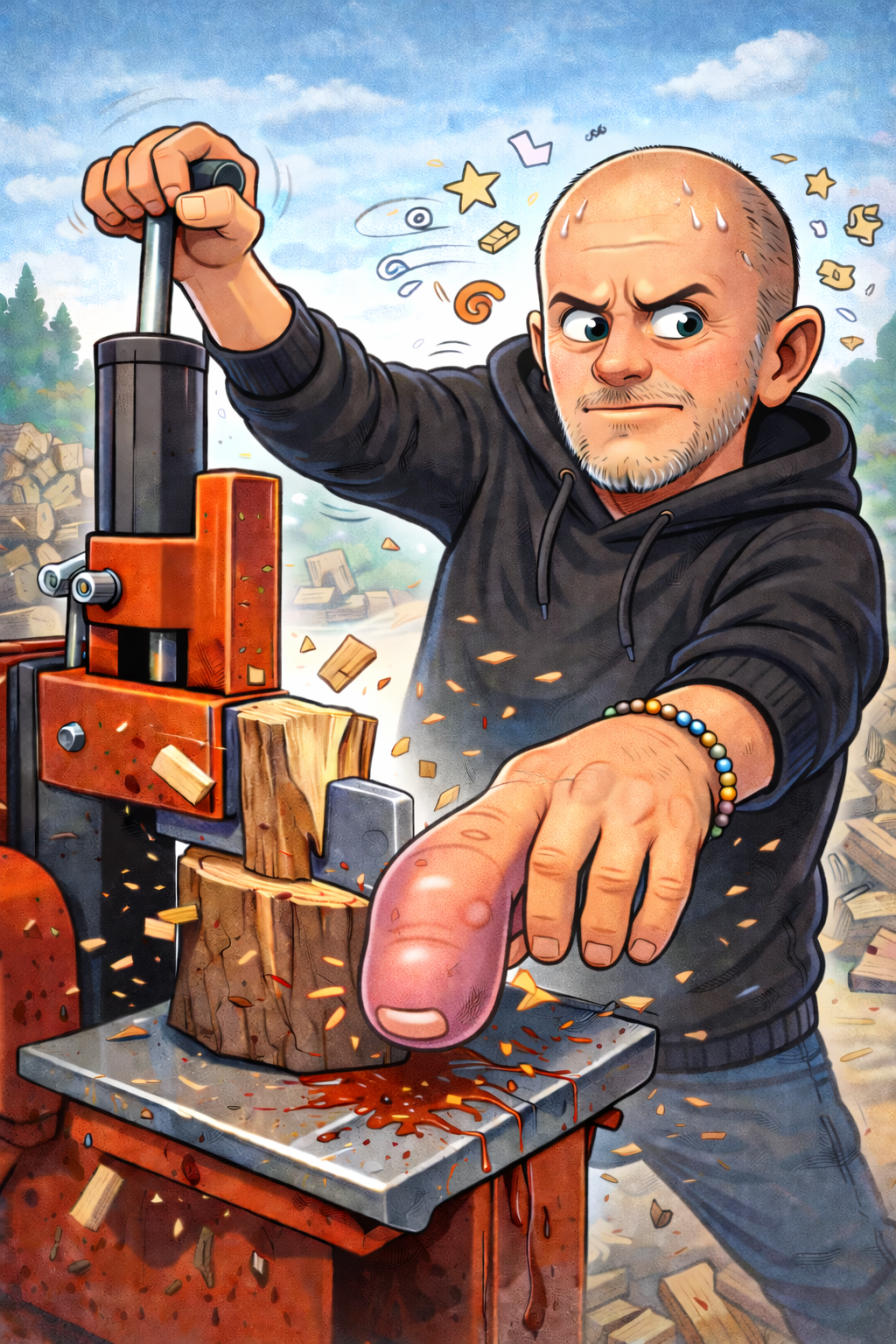 För en massa år sedan så klämde han fingret i en ved klyv. Fingret bröts. Slutade Robban då att klyva sin ved? Nej så minsann. Där fanns ju mycket mer ved att klyva så några sjukhusbesök fanns det minsann inte tid till. Han fortsatte helt enkelt att klyva ved i hopp om att smärtan skulle gå över och fingret skulle laga sig själv.