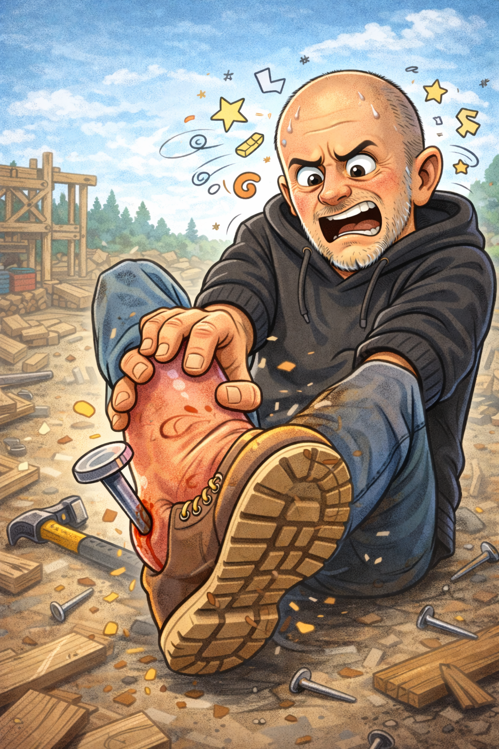 Olycksfågel som han är så har han så klart förstånd att använda arbetsskor med skydd så att han inte ska kunna få spik igenom sulan. Men vad hjälper det när spiken går in på sidan av foten?