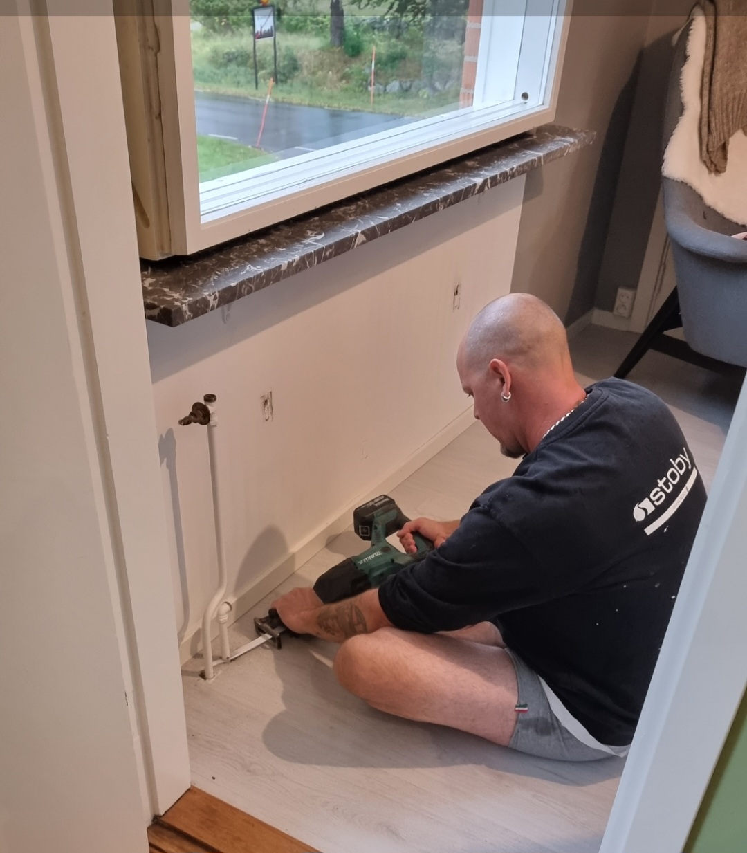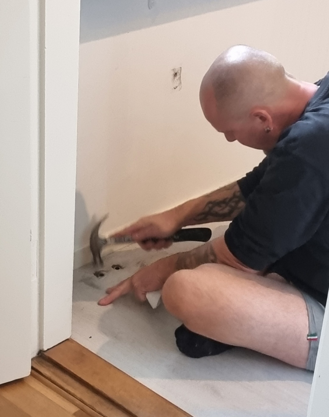 BRRRRRRRRRRRR....... Det skorrade i hela huset när han sågade. De små rörbitarna som blev kvar valde han sen att banka ner med en hammare.