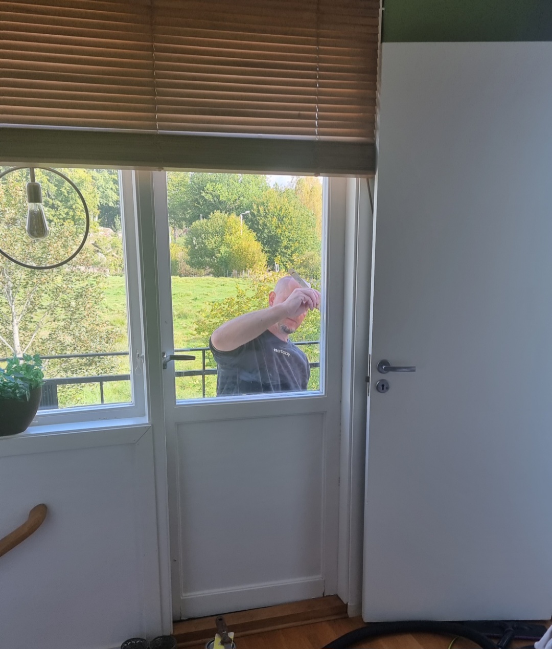 När han gav sig på att måla utsidan av balkongdörren så fick jag misshandla mig själv för att inte springa fram och låsa dörren.