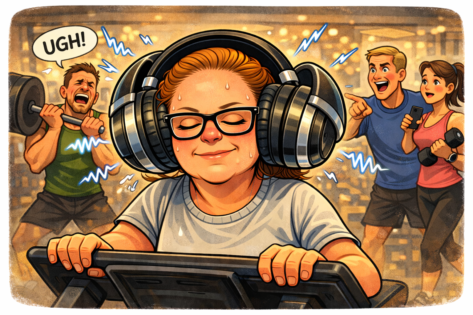 Jag får nog ta och investera i ett par gigantiska hörlurar som stänger ute allt ljud, så att jag kan fortsätta träna med humöret i behåll. Trots träningstips och stönande.