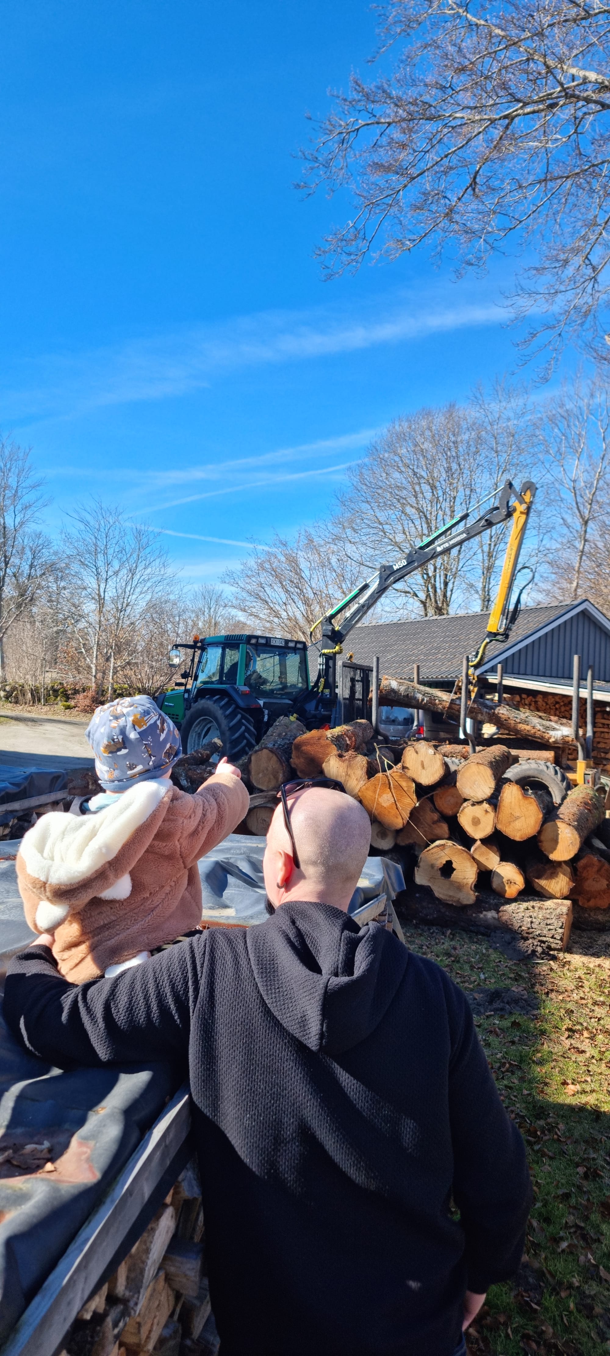 För någon vecka sedan så kom en traktor till grannen och lyfte av stora stockar!! Vi hade Leon här då och jag har aldrig sett Robban får på en liten 2 åring kläder så fort som då! Han ville visa Leon traktorn sa han. Men jag vet minsann att det bara var en ursäkt till att själv få komma ut och titta. Han utnyttjade barnbarnets traktor intresse för att själv (avundsjukt) få titta på grannens blivande ved.