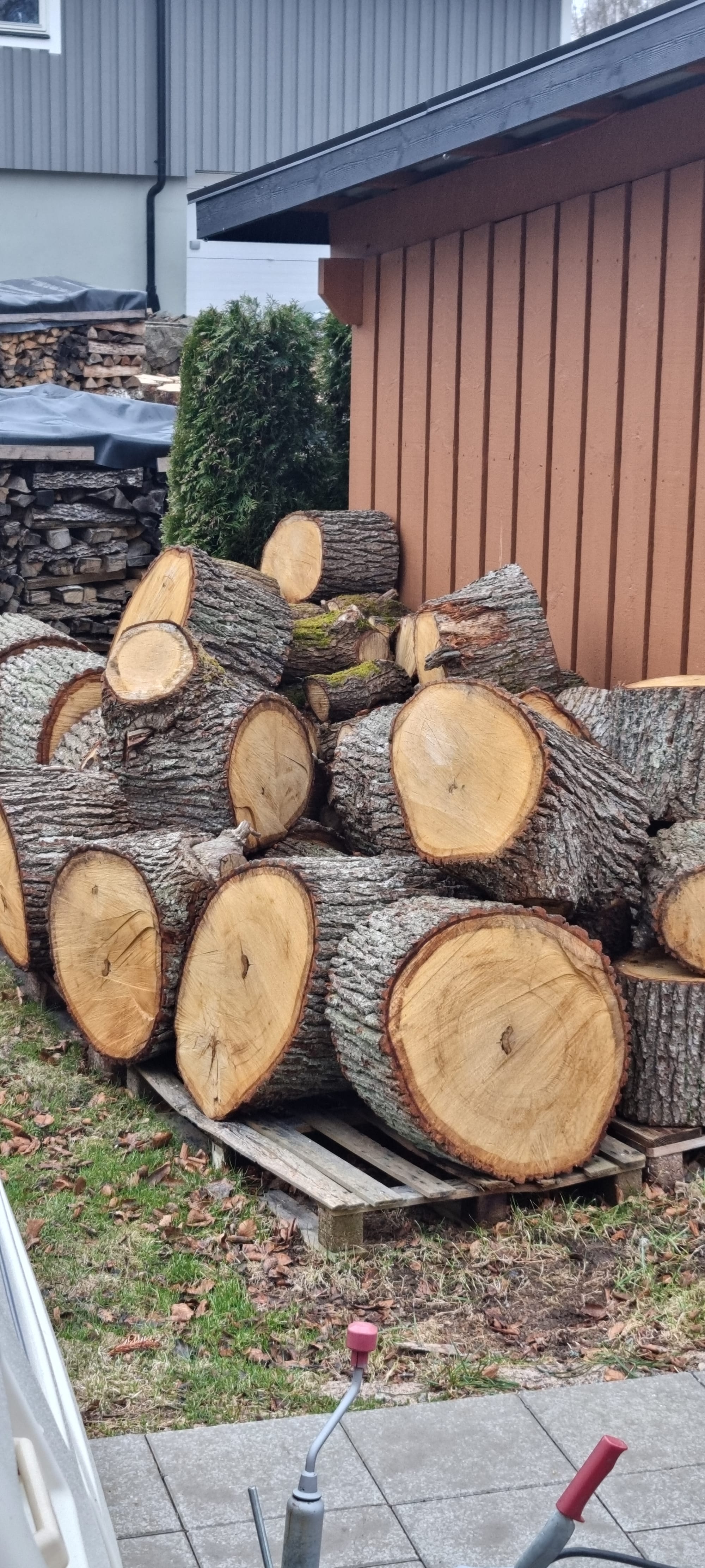 Efter att dom där stockarna kom så har vi hört hur grannen kämpat med motorsågen där på andra sidan häcken.